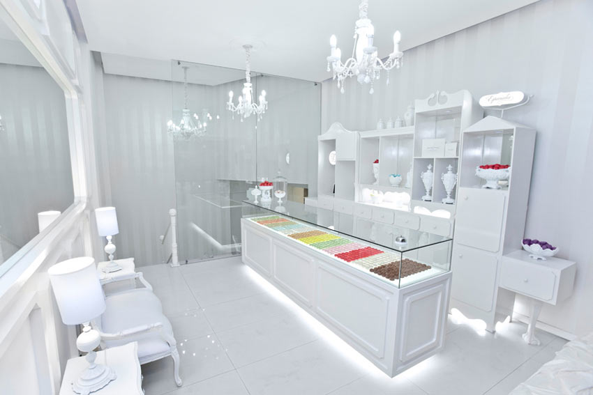 Este recurso se ha utilizado en interiorismo de locales, como por ejemplo, la Pastelería de la marca Theurel and Thomas, en Nuevo León (México), diseñada por la agencia Anagrama, donde utilizan el blanco sobre blanco en todo el mobiliario del local, para que destaque el color del propio producto.
